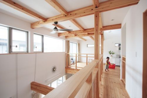 こちらの住宅はリビングを吹き抜けにして、2階部分には木材の質感を生かしたデッキを作っています。吹き抜けを作ると2階の面積は減りますが、代わりに子ども遊び場となるようなスペースが増え、家全体にもメリハリが生まれます。