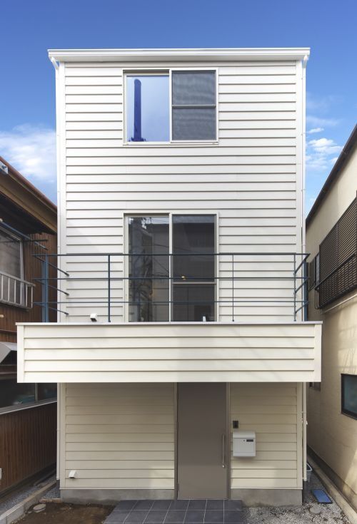 ご主人のイメージはアメリカ西海岸。サイディング外壁もインテリアも小さなパーツにさえ、アメリカンテイストにとことんこだわりました。2,3階は開放間を重視しての間仕切りなしの空間です。将来的にどのようにでも使用できます。吹き抜けからの光がさらに広がりを与えてくれています。たった10坪強の敷地とは思えない広さも高さも充実の住宅です。写真の3階の窓に高層ビルのようなものが映っているのがわかりますか?スカイツリーも見えるそうです。うらやましい眺望ですね。