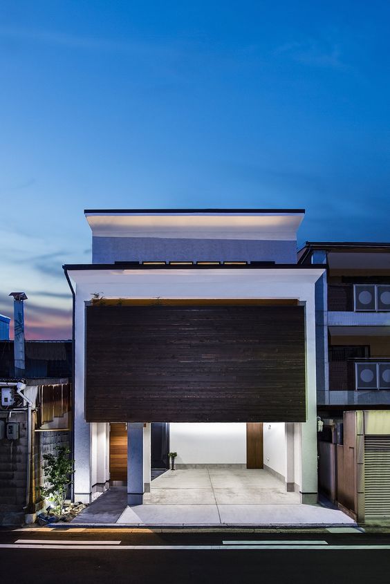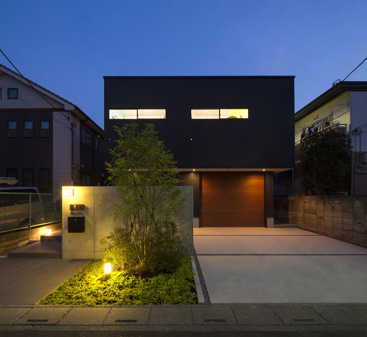 夕闇に、一際目立つガレージハウス。左側の木製扉が玄関でしょうか。それとも、ガレージの左奥に見える扉?はたまた右奥?