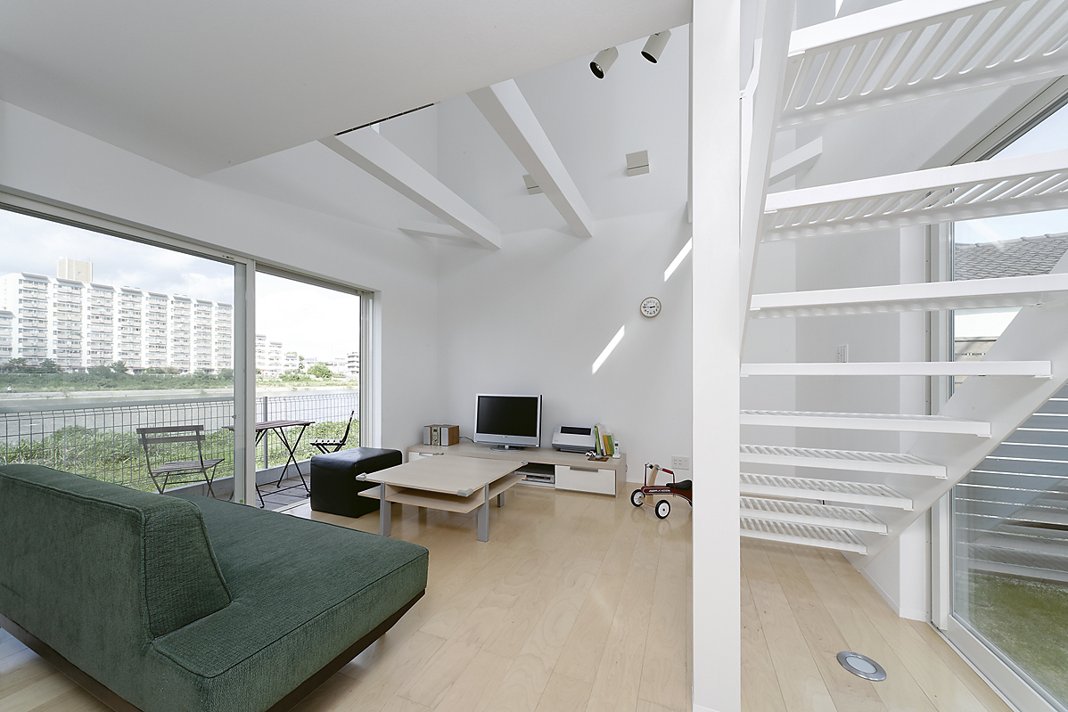 川に沿って大きく開いた窓を持つ、LDK。キッチンからの眺め、気持ちよさそうですね。眠たい目をこすって起きて出てきても、このキッチンに立ったら、シャキッと目覚めて楽しく調理できそうです!もちろん、天気の日ばかりじゃないでしょうが、例えば雨が降ったら、気持ちが落ち着いて、嵐が来たら子供の時みたいにちょっとワクワクして、雪が降ったら家の中で温もりを楽しんで。。。と四季を通して楽しめそう。