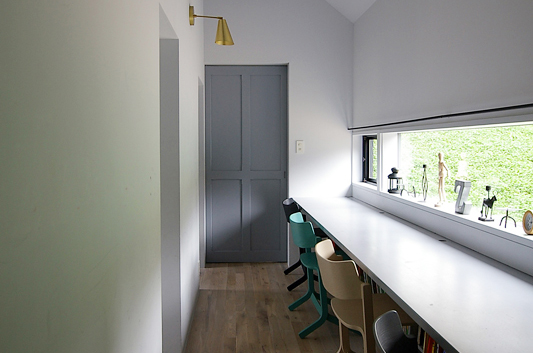 リビングと子ども部屋をつなぐ空間に設けられたこちらのスペース。 パソコン作業をここでしたり、子供が宿題をしたりと、リビングからの程よい距離感が心地良い。