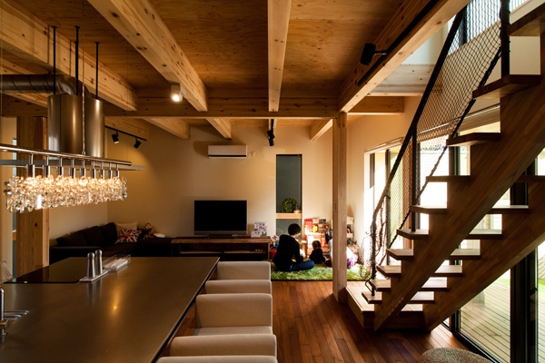 手前のキッチンはどこかのバーのようなお洒落な空間ですね。構造材に吊るされた照明器具がとてもきらびやかです。こちらのお宅は梁だけではなく、構造の床材までも見えています。ですが、手を抜いた感がないのは、細部までこだわったデザイン力のおかげでしょう!ストリップになった階段も空間のデザイン力アップに一役買っています。