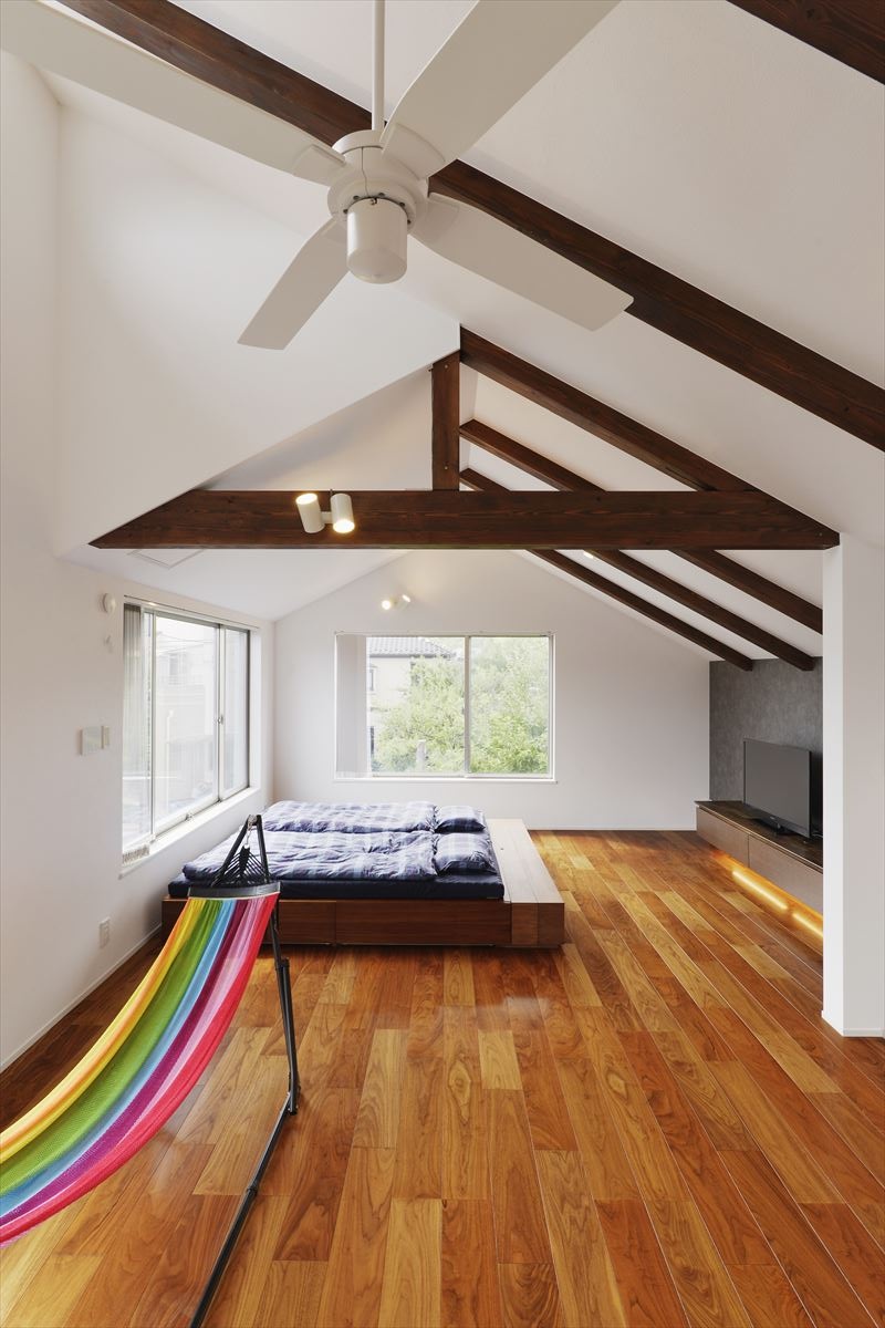 寝室の上部にある三角形状の梁は、ともすれば山小屋風になってしまいそうなところを、色を抑えめにして、壁や天井の色を白くすることで、スッキリとした印象を与えています。ハンモックがカラフルで空間にキュートさがプラスされていますね。また、梁に照明器具をつけるとそれがまたインテリアとしての役目も果たしており、部屋の雰囲気を決める大事なポイントになっていそうです。