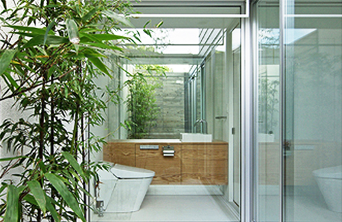 楕円形の小窓からのぞくのは、屋外の鮮やかな緑。トイレに入った瞬間に見える景色は、まるで一枚の絵のような美しさです。窓を設けることで自然光を取り入れるとともに、清々しさを与える効果も。窓の高さや大きさは、この部屋のプライベートな性格を考慮して設計されています。使うたびに心身ともにリフレッシュできる空間です。