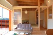 床:杉無垢フローリング、壁:珪藻土塗り、天井:ラーチ合板。小上がりの和室を脇に配置して普段は茶の間として利用、来客時には建具を閉じて客間としても利用できる。十字に組んだ柱と梁が空間のアクセントとなっております。