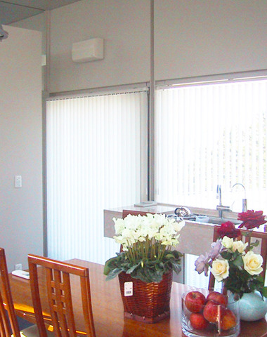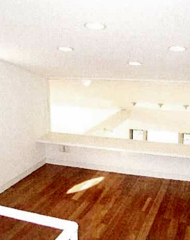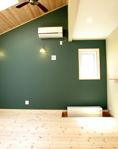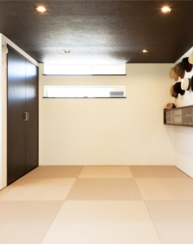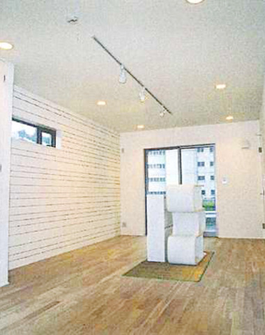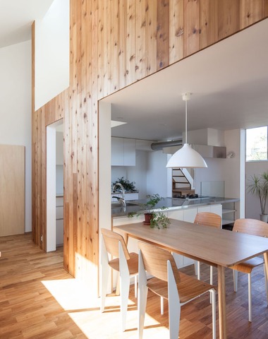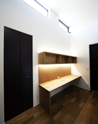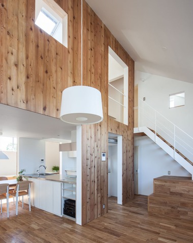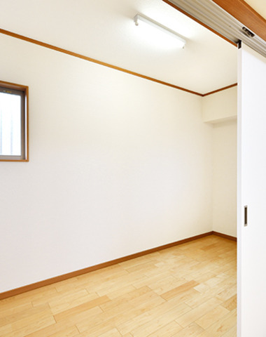 淡いグレーに着色した無垢フローリングと白いクロスに白い建具で無機質な空間を演出。 白く塗装された目透し桐板の壁がアクセントになっています。
