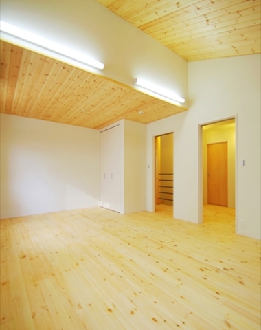 この部屋の特徴は収納重視と洋服類等と配置が重要になりました。この写真では見えにくいかもしれないですが、天井の高さは高い所で4m近くもあり、寝て頂く時の圧迫感を感じさせないように工夫させて頂き、クロスも...