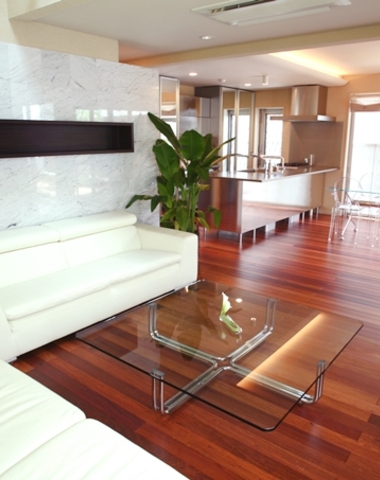 床などに使われています。素材独自の光沢がシンプルモダンの雰囲気に合います。
