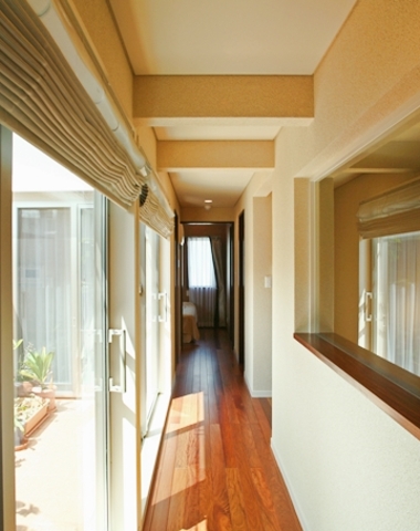 ナチュラルな木目調の温かみある廊下が室...
