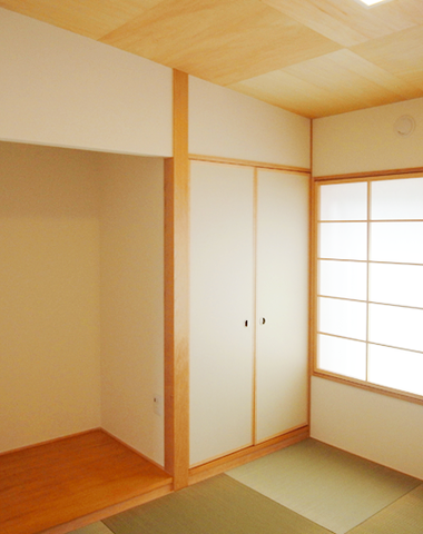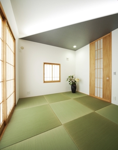 折り上げ天井が印象的なモダンな和室。 他の部屋と距離を取ることで、離れのような空間にしました。 折り上げ部分からの間接光が穏やかな光を届けます。