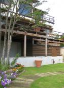 手摺、手摺子は耐候性のあるイペ材で、支柱は鉄骨で細く。