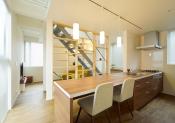 モダンな間仕切り家具越しのリビングからキッチン