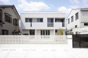 正面先はツインカーボ建具を使用し、プライバシーを確保しつつ窓のない玄関に光をもたらしている