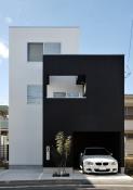 白と黒のシンプルな2つの箱が、重なりあうように建っている外観