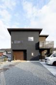 庇代わりに玄関を建物からセットバックさせた、引き戸が似合う外観
