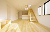 無垢材の床。温もりのある優しい印象のLDK。木製リビング階段