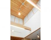 2階の各室(和室・ワークスペース)とリビングの吹き抜けの間は、前面に腰高の障子襖が設けられています。昼間は障子を介して、リビングの吹き抜け越しに日光を家の奥方まで取り入れ、夜になるとお互いの部屋から暖かい明かりが灯り、家全体を繋げます。