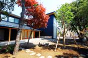 箱状のフレームの中に、黒のガルバリュウム鋼板の重量感と杉板の優しさが対比されて、アクセントとなる綺麗な玄関とすることができました。又、スロープで緩やかにのぼる体にやさしいアプローチは、車椅子の対応を考えています。