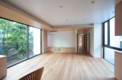 床はテラスと同じタイル貼、ふたつの大型のトップライトを設けたダイニングです。
