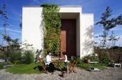 大きな開口部と、窓が無い白い塗り壁部分。このバランスを調整することで、壁の美しさを引き立てた。さらに、開口部の風景を印象づける役割も果たしている。