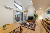 勾配天井の大きな吹抜けが暮らしを一つにする家