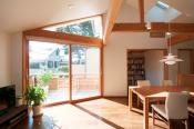 ダイニング上部に電動式のトップライトを設けています。雨センサーが付いているので、容易に開放しておく事が出来、ここを開放する事で一気に風が抜けていきます。 写真左に見える窓はロフトの窓でその部分の採光、通風を兼ねた位置としています。