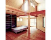 壁にしてしまうと、狭く囲まれる玄関や階段スペースを、木の格子を使い視線を通して空間の広がりを演出しています。生真面目な格子のデザインはシンプルな板貼りのインテリアの華やぎを与えています。ホール奥の上下のスリット窓も視線の抜けで広がりを感じさせます。