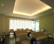 折り上げ天井の間接照明で柔らかな印象の待ち合い室