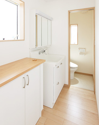 仕上げ素材を揃えた洗面と浴室。
