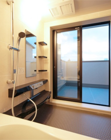 バルコニーへと続く開放的な浴室