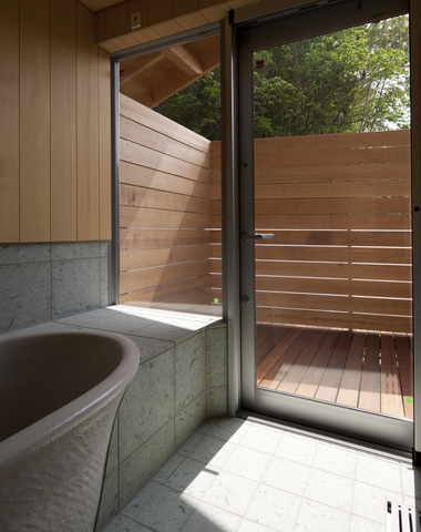 信楽焼の浴槽、浴室から出られるデッキ