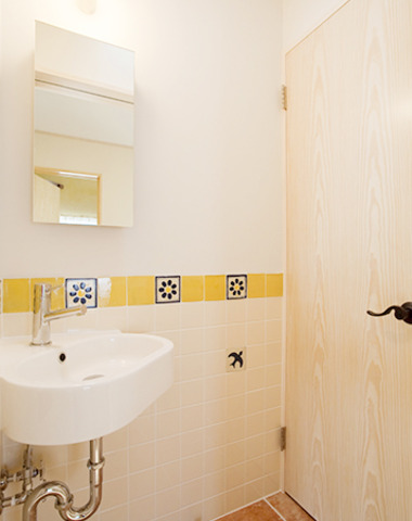 イエロータイルがアクセントの洗面スペ...