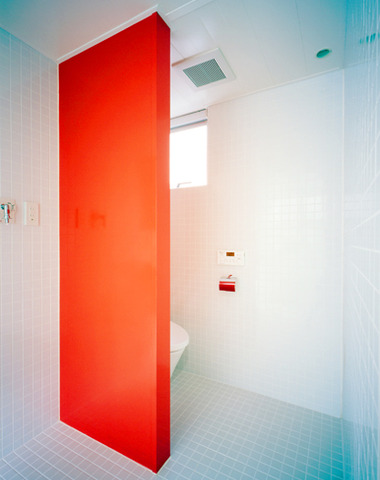 インパクトのある朱い壁が特徴の水まわり