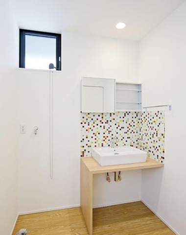 白壁にモザイクタイルが印象的な洗面台