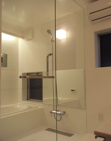 浴室扉と仕切りをガラスにし、洗面ルームと...