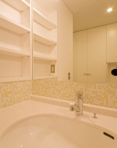モザイクタイルが爽やかな印象の洗面スペー...
