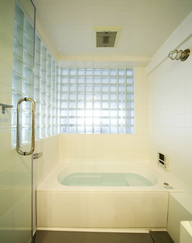 ガラスブロックの壁で明るい浴室