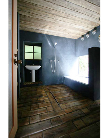 床、天井に杉の古材を再利用。壁は墨モルタ...