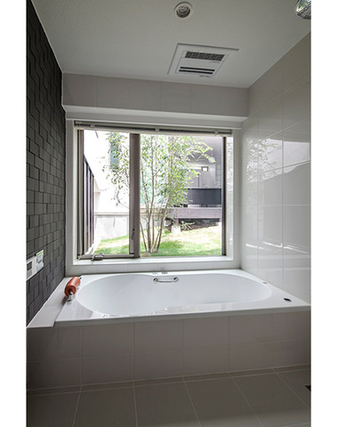 露天風呂感覚の開放的な浴室とサニタリー