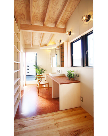 斜め天井で狭いながらも開放的な洗面・浴室...