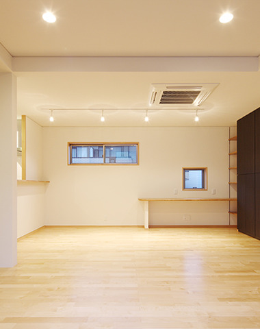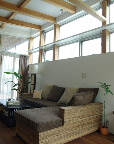 内装の袖壁と一体化したソファー