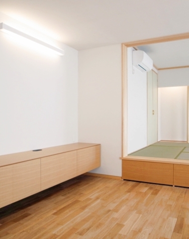 リビングには造りつけ家具と畳下のたっぷり...