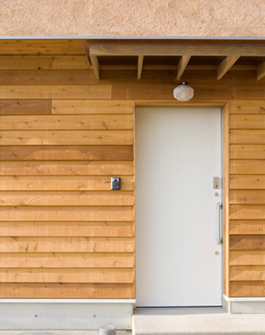木質系の外壁材です。デザイン性から人気ですが、消防法等の関係で都市部では使えない可能性が有るので注意が必要です。材料と部位の選定や保護塗料を塗る事で、耐久性を確保する事ができます。