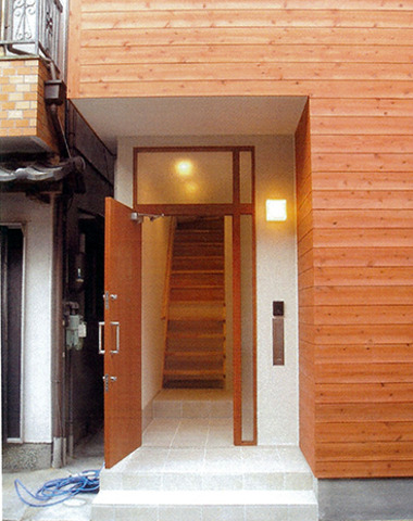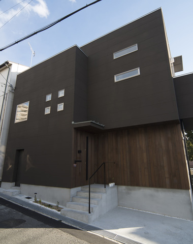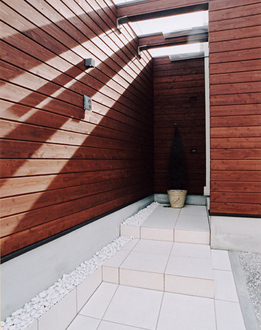 木質系の外壁材です。デザイン性から人気ですが、消防法等の関係で都市部では使えない可能性が有るので注意が必要です。材料と部位の選定や保護塗料を塗る事で、耐久性を確保する事ができます。