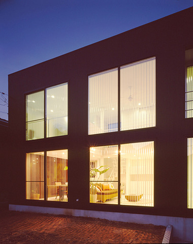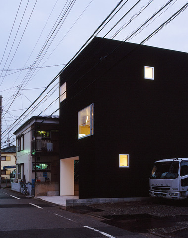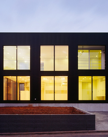 夜の光が黒い外壁を柔らかな印象に変える外...