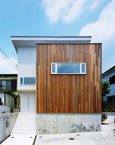木質系の外壁材です。デザイン性から人気ですが、消防法等の関係で都市部では使えない可能性が有るので注意が必要です。材料と部位の選定や保護塗料を塗る事で、耐久性を確保する事ができます。