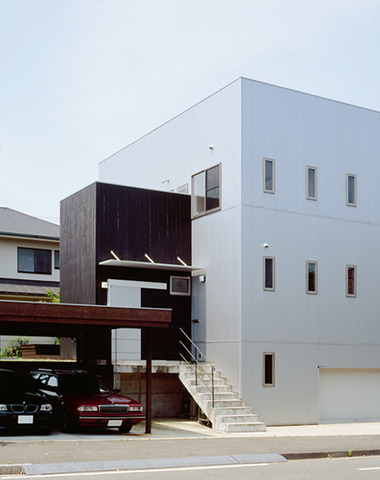 北面の玄関側は、ハコとハコを組み合わせた...