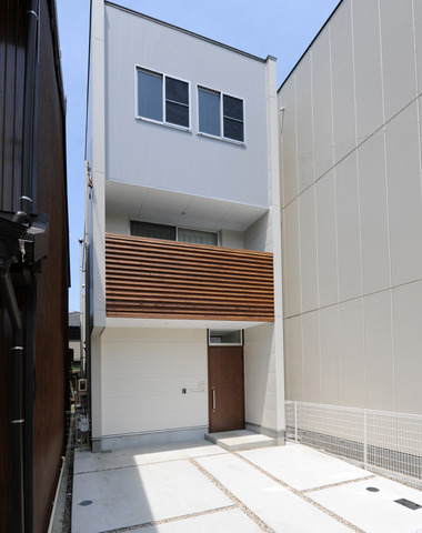 無機質な質感の外観に、太めのルーバーをデ...
