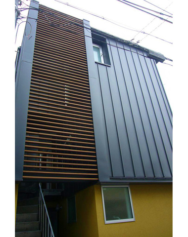 2色のガルバリウム鋼板を張り合わせた外壁...