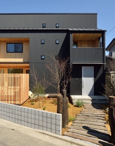 黒いガルバリウム鋼板のシャープな外観の中に杉板張りや木材で囲った ウッドデッキや植栽が柔らかな雰囲気を作りだしています。